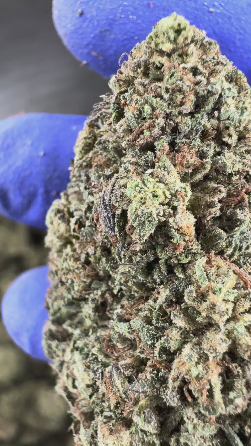 Die Blüten sind sehr sorgfältig getrimmt und weisen eine schöne, kompakte Struktur auf. Die Farben reichen von Dunkelgrün bis Hellgrün, mit schönen orangefarbenen Stempeln und deutlich sichtbaren Trichomen.